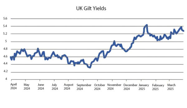 Gilt yields continued to rise over Q1 2025, largely in tandem with US Treasury yields, which spiked in response to Trump’s economic policies. However, the yield rise moderated later in the quarter, with the Bank of England cutting rates by 0.25% to 4.5% in February, before holding them steady in March.